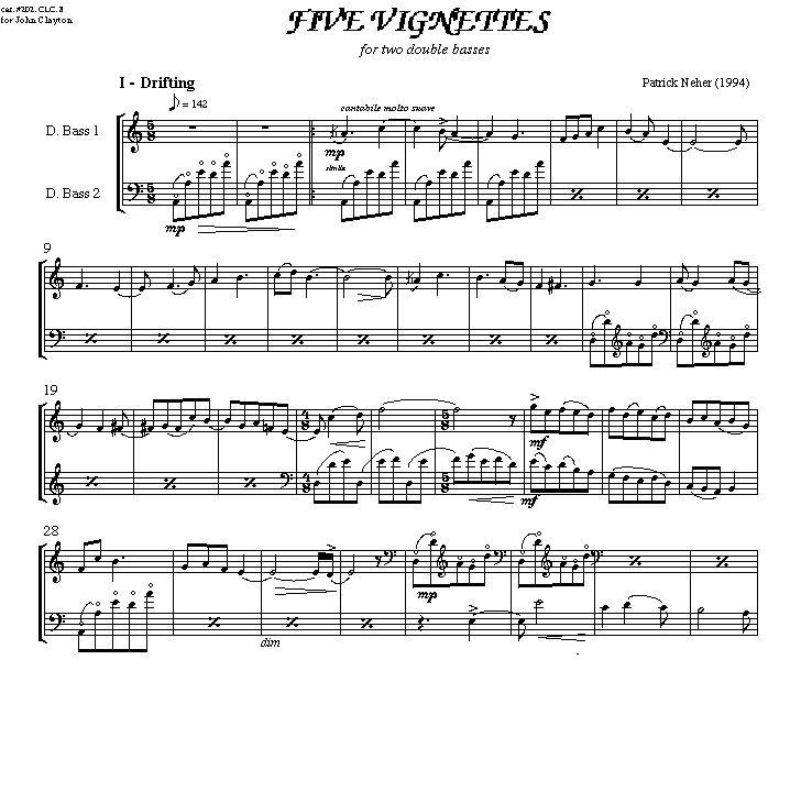 One of Patrick Neher's most popular compositions, written for John Clayton in 1994. Premiered in Canada in 1994 by Patrick Neher and John Clayton. It is recorded on the CD album "Bass Ascending, vol.1" with Patrick Neher and David P. Murray. The piece has elements of jazz and classical playing and is about 18 minutes long. Movements are 1. Drifting, 2. Chorale, 3. The Snake, 4. Liza, 5. Goodbye My Love (which has two bass solos, a samba, and an ending berceause - cradle song). The sheet music and the CD are published by ISG Publications: Copyright and All Other Rights are Reserved.